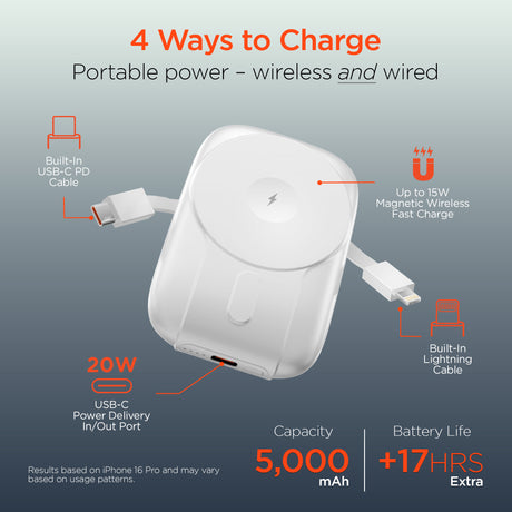 HYPERGEAR 5,000mAh Mag Grip Go Magnetic Wireless Fast Charge Power Bank with Built-In Cables